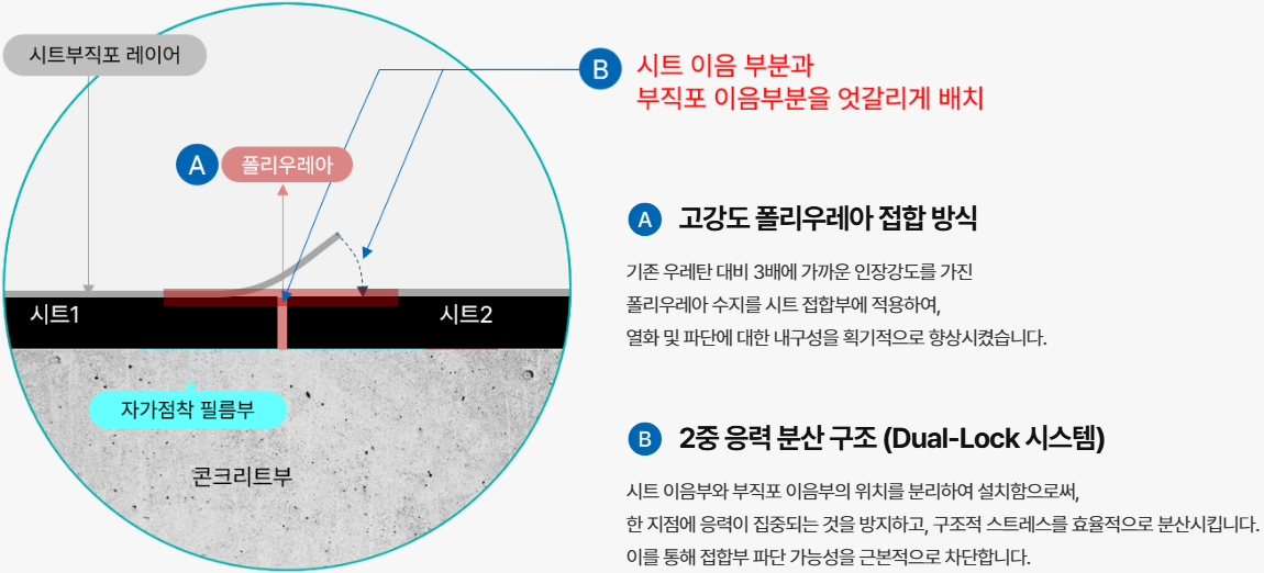 시트 접합부의 약점을 보완하기 위해 개발된 고강도·고내구성 방수 시스템입니다.